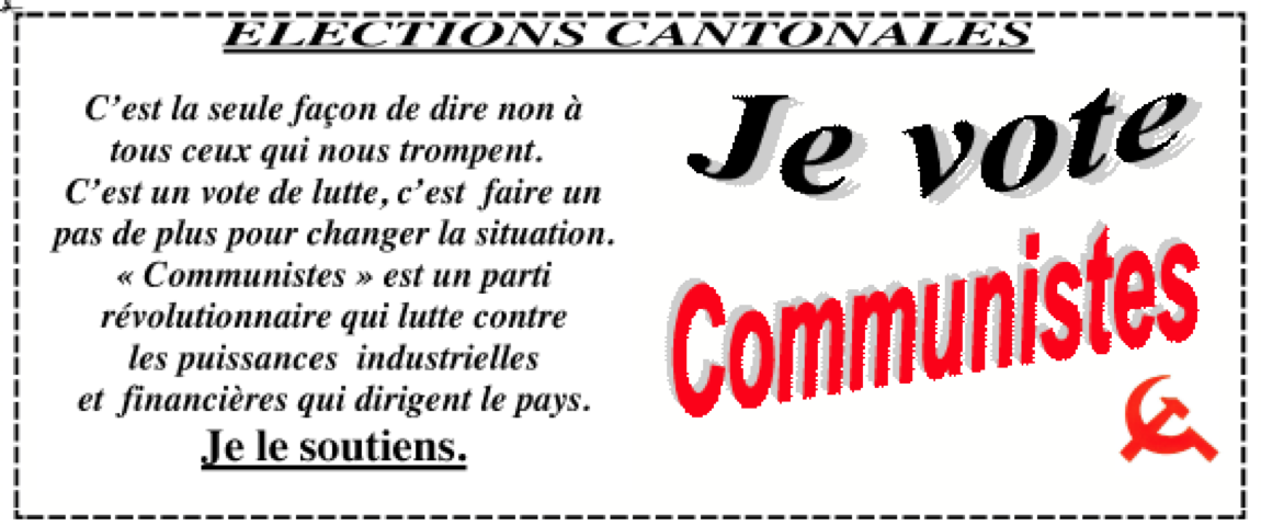 Droite, le PS et ses alliés subventionnent les entreprises avec l’argent des contribuables Elections cantonales : Votez pour « COMMUNISTES » « Conserver le modèle du capitalisme »(LE PEN) Bulletin de vote à télécharger |
